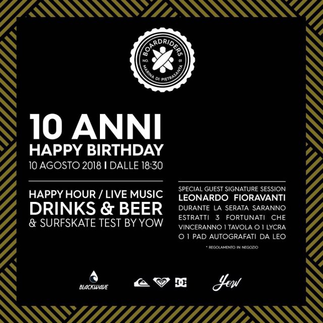 Il surf shop più cool della versilia si prepara per un compleanno da fuochi d’artificio, venerdì 10 agosto 2018, a partire dalle ore 18:30. Special guest della serata il surfer italiano più amato di tutti i tempi, sicuramente il più forte e il più ricercato, Leonardo Fioravanti.