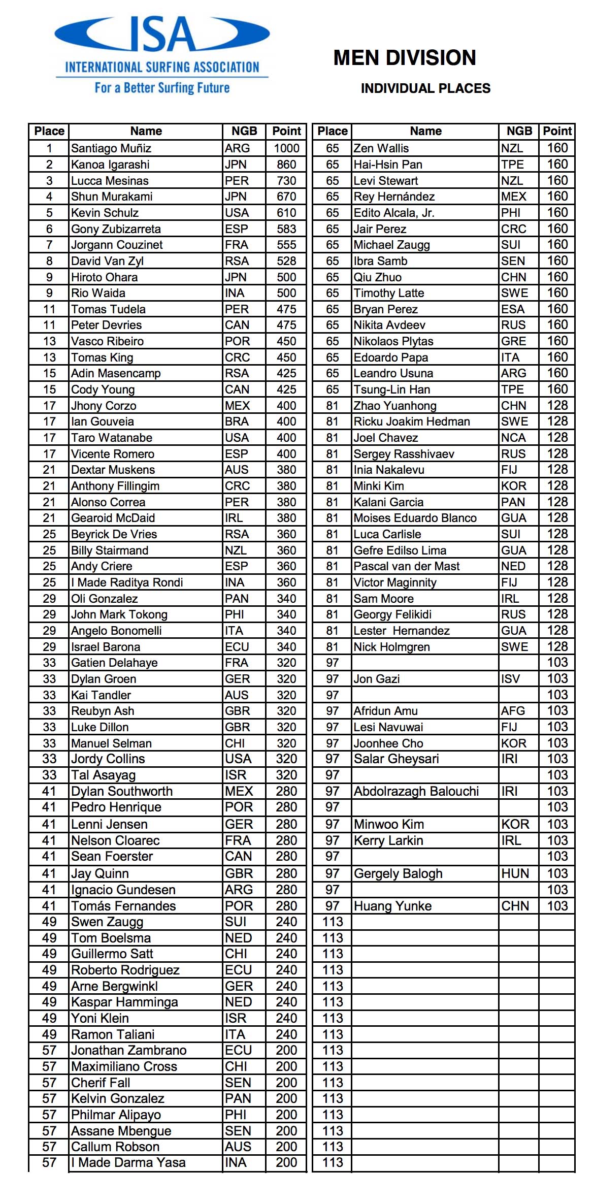 Per quanto riguarda l’Italia, dopo l’uscita definitiva anche di Claire Bevilacqua e Giada Legati dal quarto round ripescaggi, la posizione del team Italia nella classifica finale è al 16esimo posto con 1640 punti, un ottimo risultato considerando il 29esimo posto raggiunto ai WSG in Francia. Migliore risultato individuale maschile per gli italiani è quello di Angelo Bonomelli al 29esimo posto (l’anno scorso a Biarritz, Bonomelli aveva concluso al 33esimo posto) seguito da Ramon Taliani al 49esimo e da Edoardo Papa al 65esimo posto.