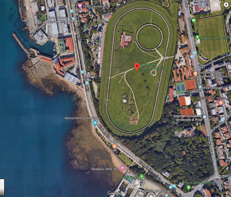 L’ippodromo Caprilli, chiuso dal 2016, si trova appena dall’altra parte della strada rispetto ai Bagni Fiume, uno degli spot cittadini più cari ai surfisti labronici, e si estende su un’area di 180.000 metri quadrati.