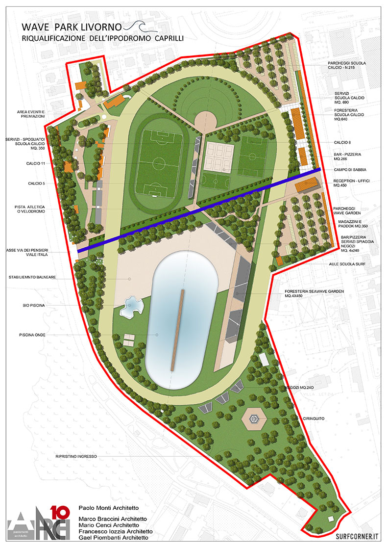 Secondo quanto rivelato recentemente dal quotidiano d’informazione Il Telegrafo di Livorno, il progetto nasce da un gruppo di architetti, guidati da Paolo Monti, insieme all’imprenditore e surfista Nicola Pinzauti (ricordate l’amico di lettera di Chris Del Moro nel film Bella Vita?) e si inserirebbe nel bando di concorso per la riqualificazione dell’Ippodromo Caprilli, dove dovrebbe sorgere la Cittadella dello Sport.