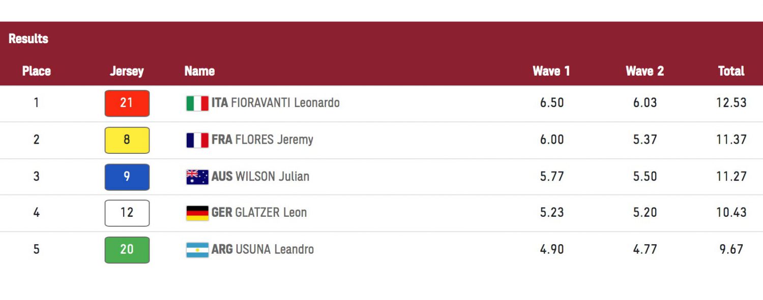 Per il resto è stata tutta una questione di spartirsi il secondo e terzo posto tra Julian Wilson e Jeremy Flores, mentre il tedesco Leon Glatzer non è più riuscito a raggiungerli pur atterrando diversi air reverse degni di nota. Eliminato anche l’argentino Leandro Usuna.