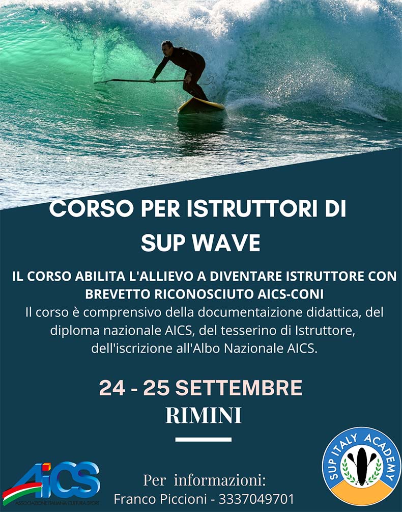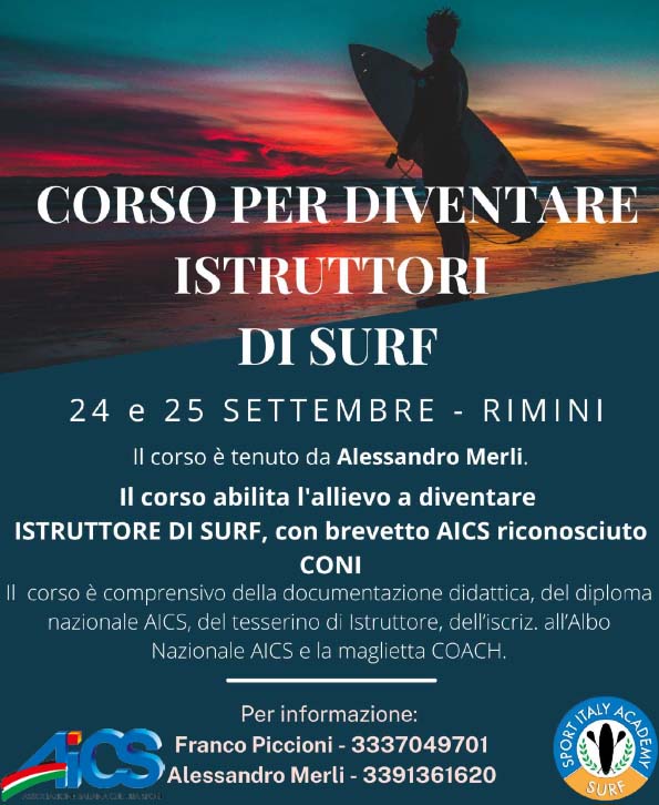 Sono aperte le iscrizioni per il corso istruttori surf che si terrà il 24 e 25 settembre al bagno 8 di Rimini, organizzato dalla direzione nazionale AICS in collaborazione con Sup Italy Academy.