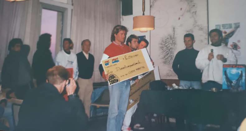 C.M.: Quello che ricordo di quel primo evento Epsa in Italia, furono le parole di Francois Payot e Esteban Roses che mi dissero di questa prima gara in Toscana, a Viareggio, e la cosa, per uno nato e cresciuto in Sud Africa profumava di avventura, non avendo mai immaginato che in Italia si potesse fare surf. Il giorno della gara era freddo e si vedeva la neve sulle montagne, le onde erano piccole ma ben formate. Io vinsi la gara dell’expression session e Alessandro (Dini) mi consegnò un grande assegno (vedi foto) che misi nella sacca delle tavole e mi portai in Sud Africa. La cifra era di 250.000 lire, sembrava una cifra enorme. I miei amici quando lo vedevano appesa nella mia camera, esclamavano: “Wow, it look sas a lot of money!” e io mi smargiassavo rispondendo: “Yeah, I am rich now, I won a big contest in Italy!”. Poi ricordo altri amici come Stefano Giuliani, con i quali abbiamo surfato gli spot toscani, e soprattutto del cibo davvero… amazing! Davvero momenti incredibili.