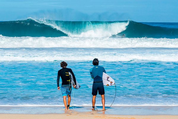 Leonardo Fioravanti insieme al team Quiksilver al completo sulla north shore hawaiana.