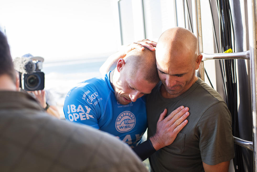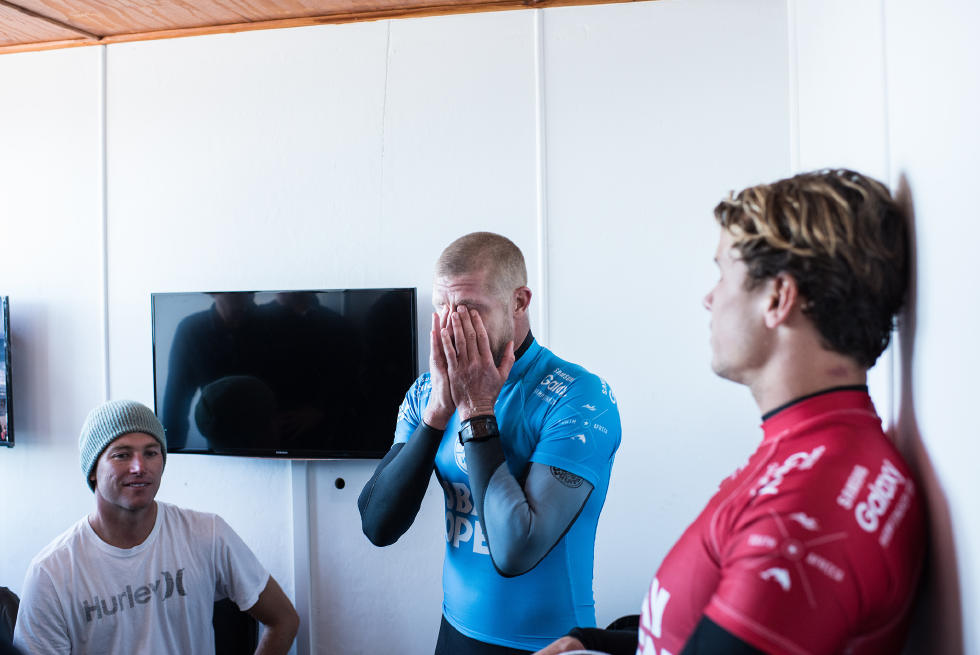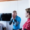 Julian Wilson e Mick Fanning, felici di essere sani e salvi negli spogliatoi del JBay Open. Foto WSL/Kirstin