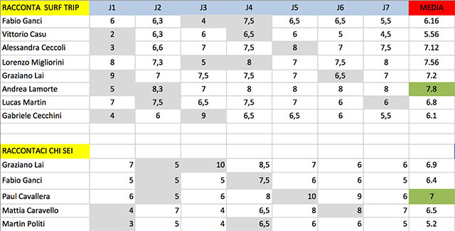 Dai voti così ottenuti sono stati scartati per ciascuno il voto migliore e quello peggiore, secondo un format utilizzato spesso anche in competizioni di surf, con i voti rimanenti è stata fatta la media e si è arrivati così a definire un voto finale per ciascuno e da qui la classifica finale, che vi mostriamo nello schema qui sotto.