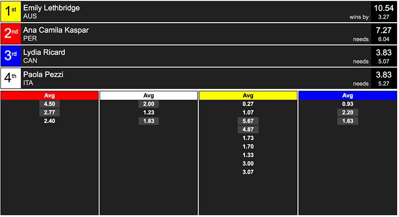 Francesca Rubegni ha dominato la sua heat vincendola e approdando al secondo round ripescaggi, dove è approdata anche Paola Pezzi che non è riuscita a risalire dalla quarta posizione nella sua batteria del secondo round e ripartirà dal secondo round ripescaggi.