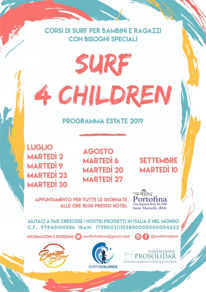 Ecco il programma Estate 2019 di Surf 4 Children e le date dei corsi per bambini e ragazzi con bisogni speciali organizzati in collaborazione con Banzai surf school e la fondazione Prosolidar