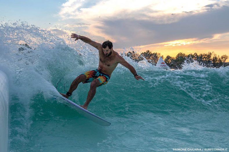 “Avevo già surfato un’onda simile in Germania. Si impara in fretta, con un’istruttore che ti da due dritte è molto immediato. E’ diverso dal surf in mare perchè è diversa l’importazione del peso sulla tavola. In mare l’onda ti spinge avanti, questa ti spinge indietro, se provi a scendere giù potente come nel mare ti sputa fuori, però è utile per fare pratica e mantenere il feeling, ti aiuta a stare allenato. Non penso che ti aiuti a migliorare il tuo surf sull’onda normale perchè è completamente diversa, se vedi i surfisti dell’Eisbach sono molto bravi ma poi in mare lo sono molto meno. Però divertentissimo sicuramente.”