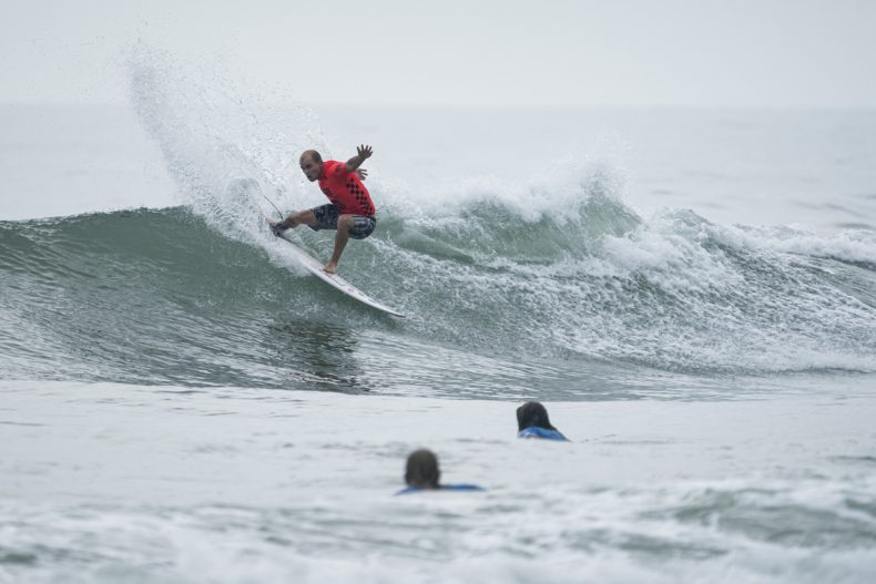 Prima Angelo impressona passando il terzo round del main event davanti all’11 volte campione del mondo Kelly Slater, poi al quarto round passa ancora primo la sua heat davanti al campione costaricano Carlos Munoz, infine al quinto round, stremato, si trova schiacciato tra i giganti Slater e Medina da un lato, e il talentuoso re dei Young Guns, Rio Waida, dall’altro.