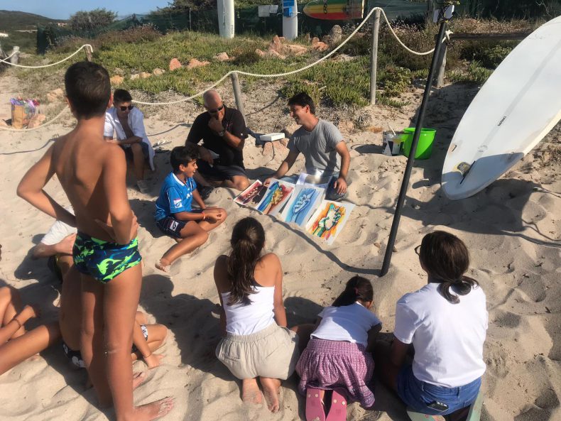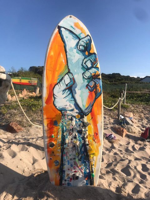 La manifestazione si è svolta con il patrocinio del Comune di Trinità d’Agultu, da sempre attento all’ambiente: la mattinata è iniziata con la raccolta delle microplastiche da parte di oltre cinquanta alunni delle scuole primarie e secondarie di primo grado di Trinità. Bambini e ragazzi hanno scandagliato la battigia della Marinedda alla ricerca dei rifiuti portati dal mare o abbandonati dai bagnanti. Nel primo pomeriggio, insieme a circa venti ragazzi provenienti anche dai plessi scolastici di Viddalba e Badesi, Vincenzo Ganadu ha coinvolto tutti in un gioco artistico. I giovani hanno prima selezionato le microplastiche e poi hanno aiutato Ganadu a dipingere dal vivo una tavola da surf e ad applicare i piccoli rifiuti trovati nella parte bassa del dipinto. Il disegno si ispira a uno dei lavori più simbolici del pittore nato a Sassari nel 1973 e ormai sempre più impegnato nella surf art. « È la Presa di coscienza – spiega Vincenzo Ganadu – si tratta di una mano che stringe la tavola nasce e dall’esigenza di urlare il disagio per il cambio climatico e l’inquinamento degli oceani».
