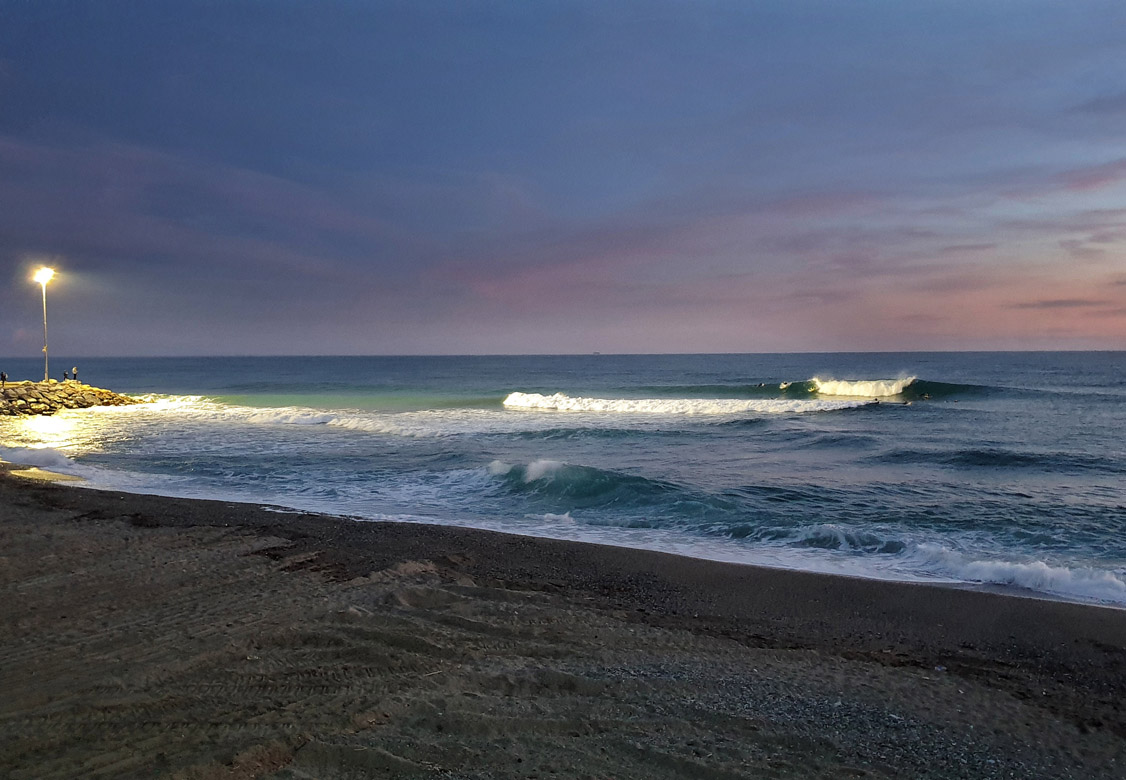 Sul molo di Varazze è tornato operativo il faro per surfare anche di notte e Filippo Orso ha approfittato della sua inaugurazione per concedersi un’ultima session dopo il tramonto.
