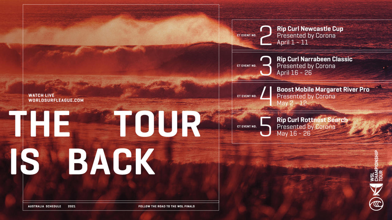 La WSL ha aggiornato il leg australiano, confermando la cancellazione del Rip Curl Pro Bells Beach 2021 e del Gold Coast Pro 2021 che torneranno nel 2022. Rimodulato anche il leg australiano con tre nuove tappe.