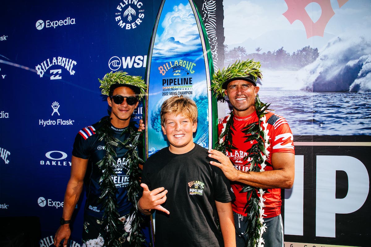 Kelly Slater e il finalista Seth Moniz insieme a Andy Axel Irons. Foto Heff/WSL