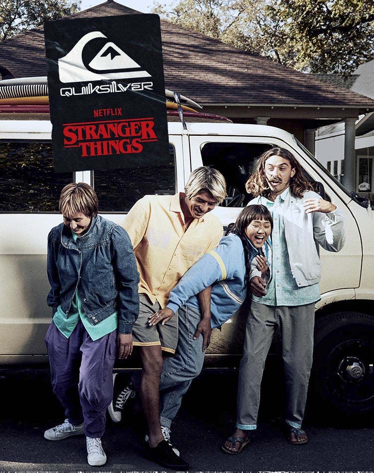In linea con le molteplici date di uscita dello spettacolo, Quiksilver presenterà più capsule collection durante la stagione, offrendo un nostalgico ritorno al passato del marchio ispirata al surf degli anni ’80, integrando elementi della trama di Stranger Things 4.