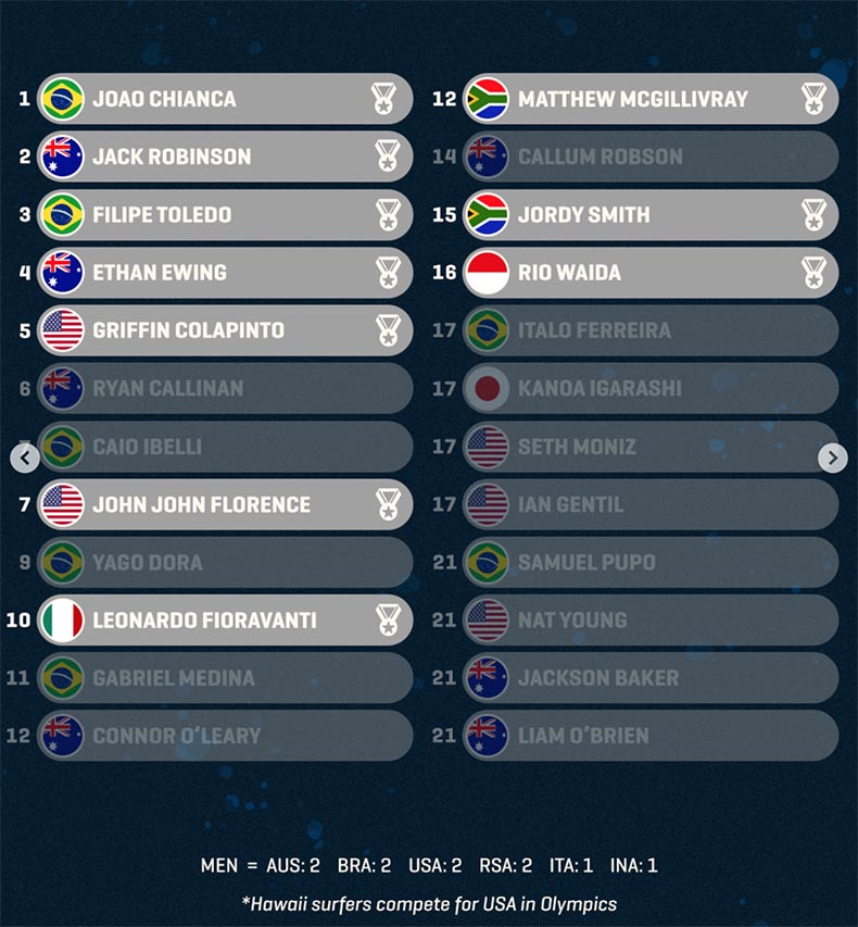 Come sappiamo, sui 48 posti disponibili per le Olimpiadi, la WSL ha a disposizione 18 slot provvisori per la qualificazione a Parigi 2024, che per il surf si svolgerà a Tahiti, di cui 10 nella categoria maschile e 8 in quella femminile, da determinarsi in base al ranking del Tour a fine anno.