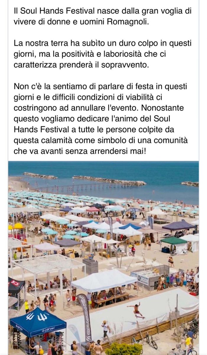 “Con enorme ed immenso dispiacere, siamo a comunicare che vista la situazione meteo, la viabilità autostradale e ferroviaria interrotta nonché le enormi problematiche e gli ingenti danni, ci troviamo a dover ANNULLARE LA MANIFESTAZIONE “SOULHANDS FESTIVAL” ed anche la gara di SURFSKATE.”