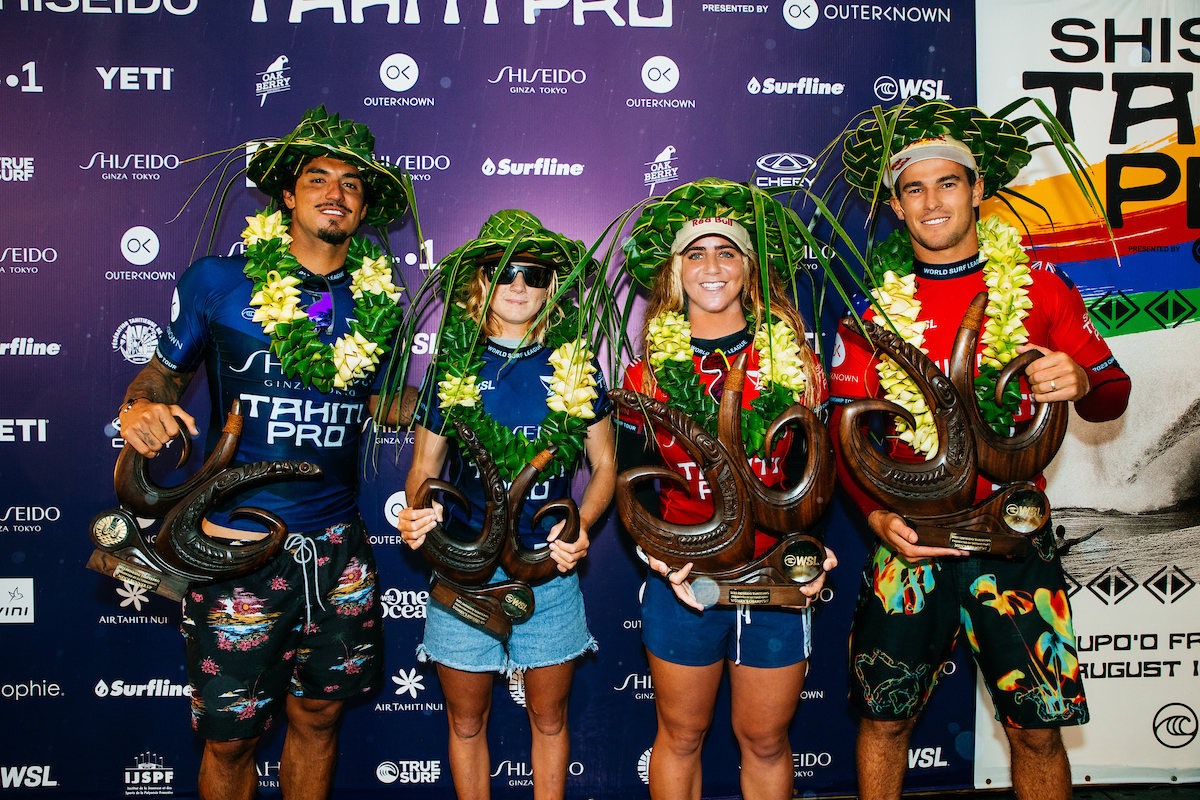 I vincitori del Shiseido Tahiti Pro, Robinson e Marks, insieme ai runner up, Gabriel Medina e Caitlin Simmers. Foto WSL