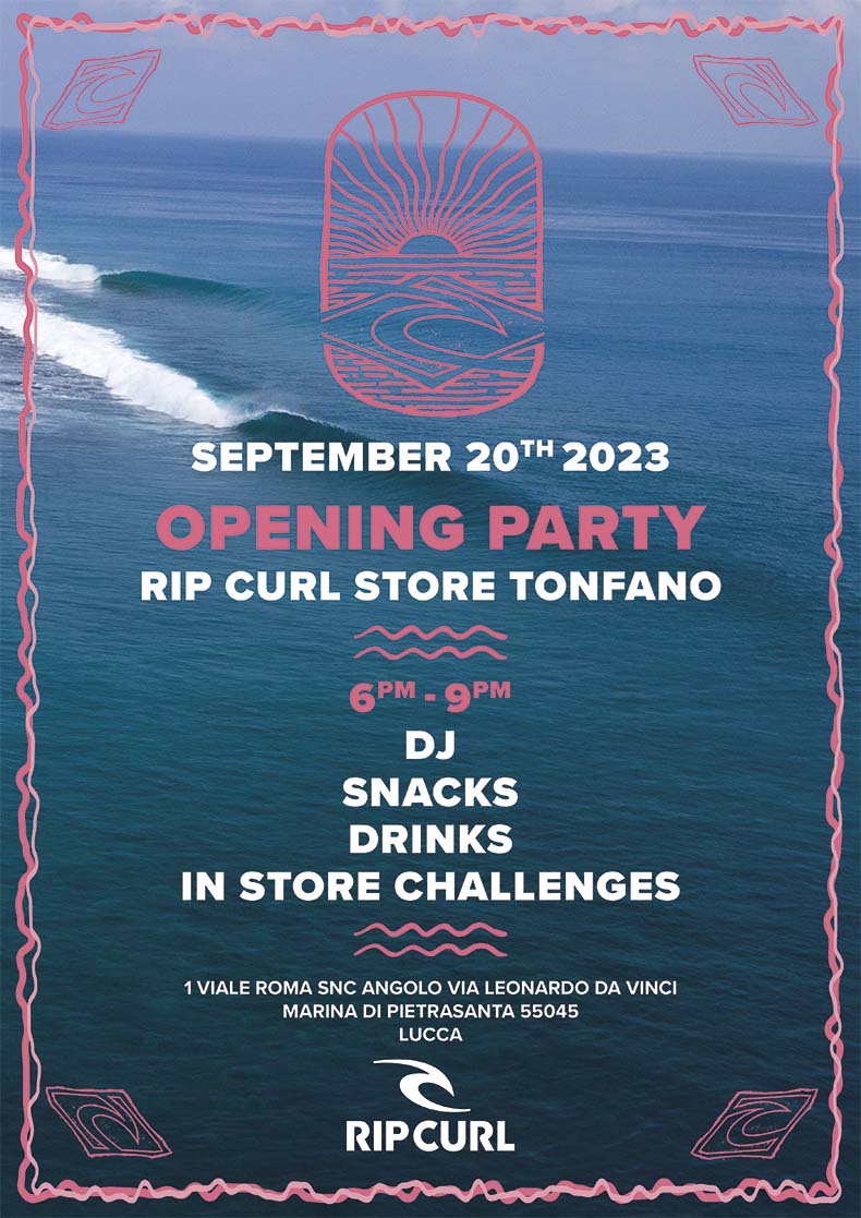 L’intera Rip Curl crew vi invita con grande piacere ad unirvi alla festa di apertura del negozio, che si terrà mercoledì 20 settembre dalle 18:00 alle 21:00, presenti i riders Rip Curl, Dj set, surf-movies e drinks per tutti.