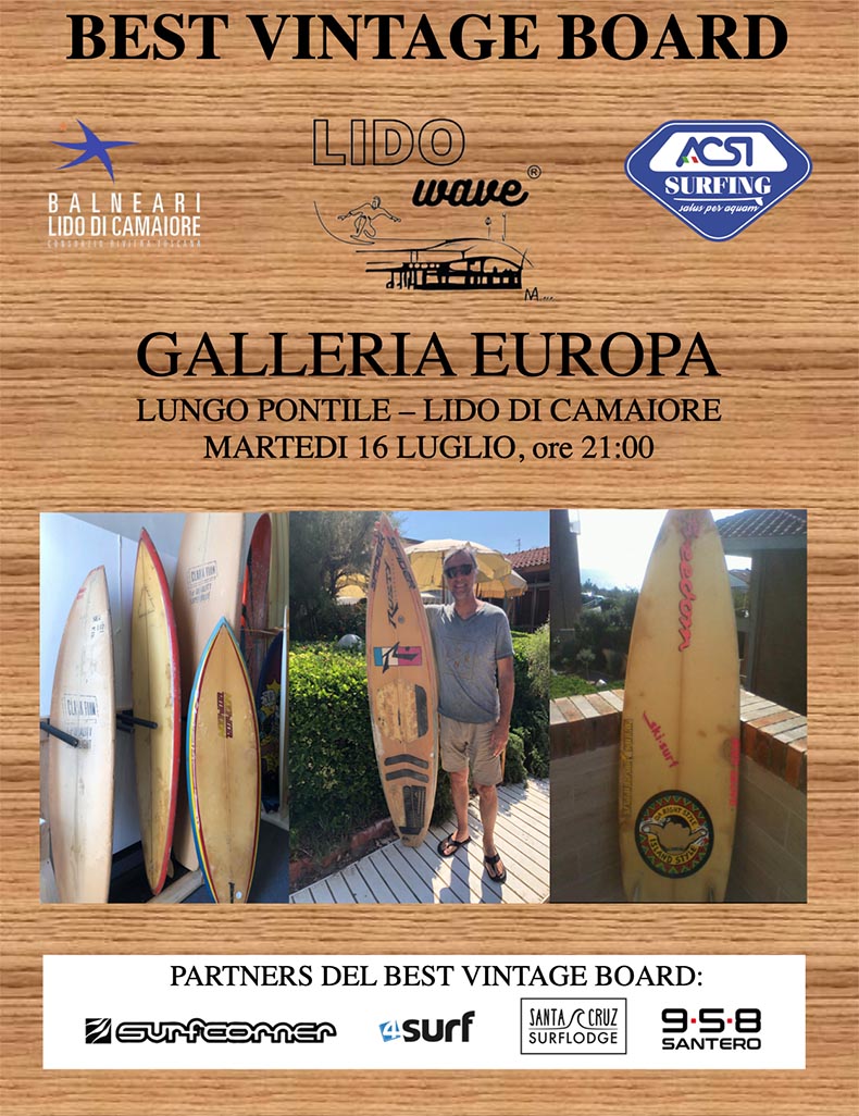 Appuntamento quindi con la storia del surf italiano alla Galleria Europa, Pontile Lungomare Europa, 55041 Lido di Camaiore LU, un centinaio di metri a sud del pontile, ricordando che per tutto il periodo di Lido Wave sarà allestita come un piccolo Museo del Surf, con esposizione di quadri, sculture, fotografie e documenti vari.