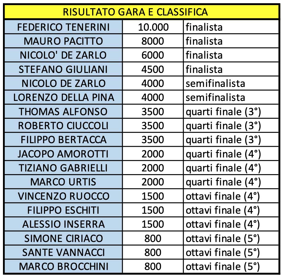 La finale ha visto prevalere Federico Tenerini che di batteria in batteria è andato in crescita. Ottimo secondo posto di Mauro Pacitto (ASD Pointbreak-Fregene), partito fortissimo e autore dei punteggi più alti. Purtroppo, in finale la stanchezza e la scelta del lato destro del campo gara non l’hanno favorito. Terzo un altro surfista “apuano”, il massese Nicolò De Zarlo. Quarto la leggenda versiliese Stefano Giuliani.